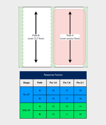 Access floors reduced measured response factors by 16–22%, indicating a noticeably less lively and more stable walking experience.