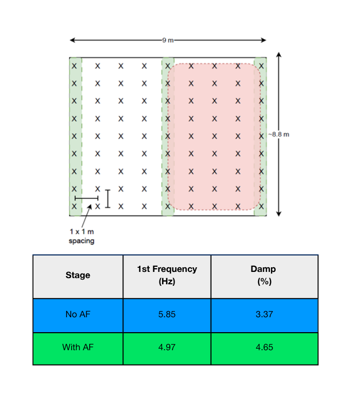 Damping increased by approximately 25% when the access floor was installed — a significant improvement that reduces vibration duration and enhances comfort.