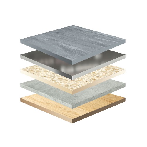 Can be factory produced with a bonded resilient surface covering. There are many finishes available including vinyl, linoleum, rubber, HPL